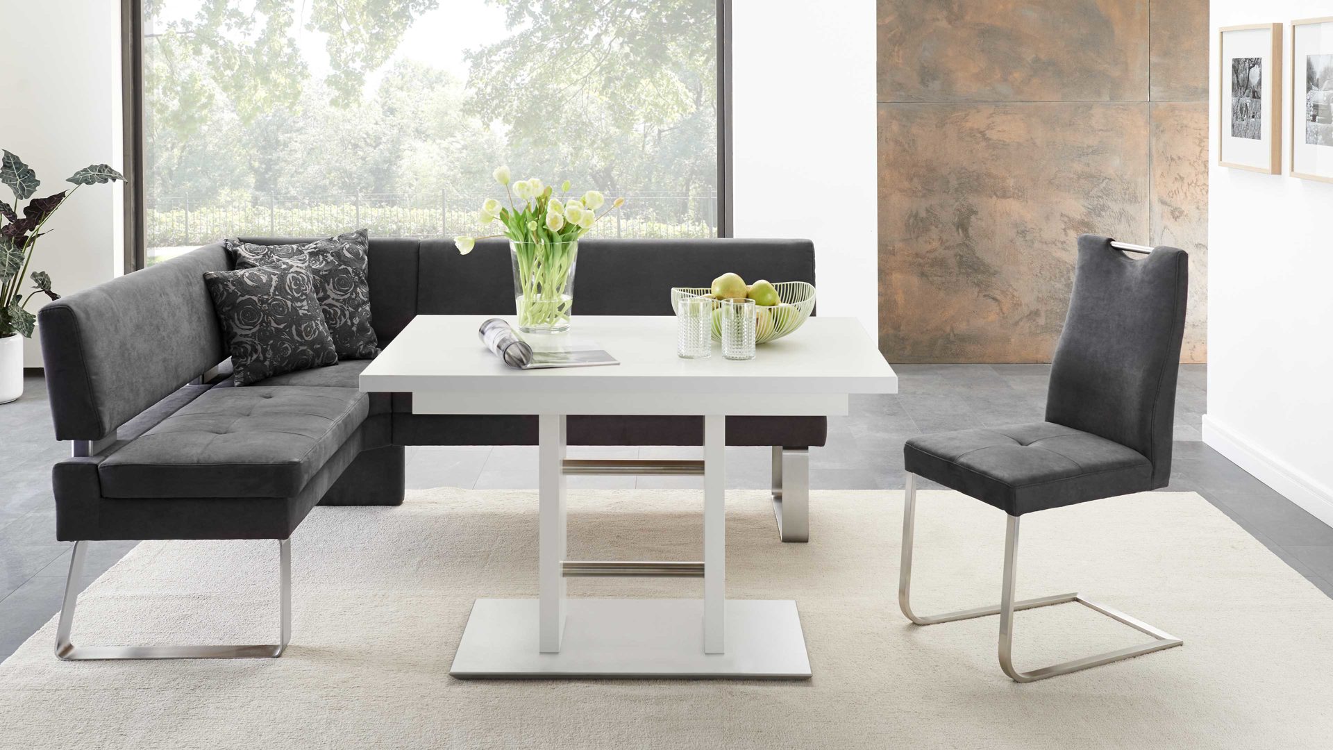 Auch optisch macht der Freischwinger einiges her. Als stabilisierende Basis fungiert ein klassisches Edelstahlgestell. Es harmoniert bestens mit dem soften Mikrofaserbezug im modernen Farbton Anthrazit. Stilsicher abgerundet wird der Combinessa Polsterstuhl Genesis durch die akzentuierende Steppung der Sitzfläche.
