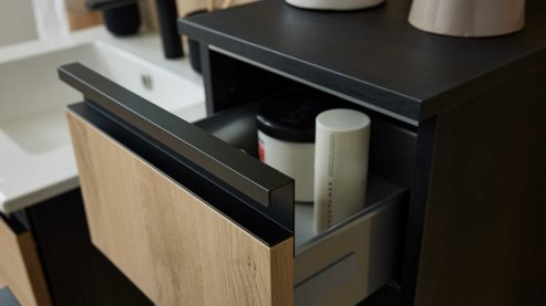 Der Hängeschrank überzeugt mit einer Metallschublade und einem Metallauszug, beide ausgestattet mit Premium-Dämpfungstechnik für besonders leises und sanftes Schließen. Die elegante schwarze Ablageplatte setzt einen modernen Akzent und unterstreicht das hochwertige Erscheinungsbild – perfekt, um Pflegeprodukte, Deko oder Accessoires stilvoll in Szene zu setzen.