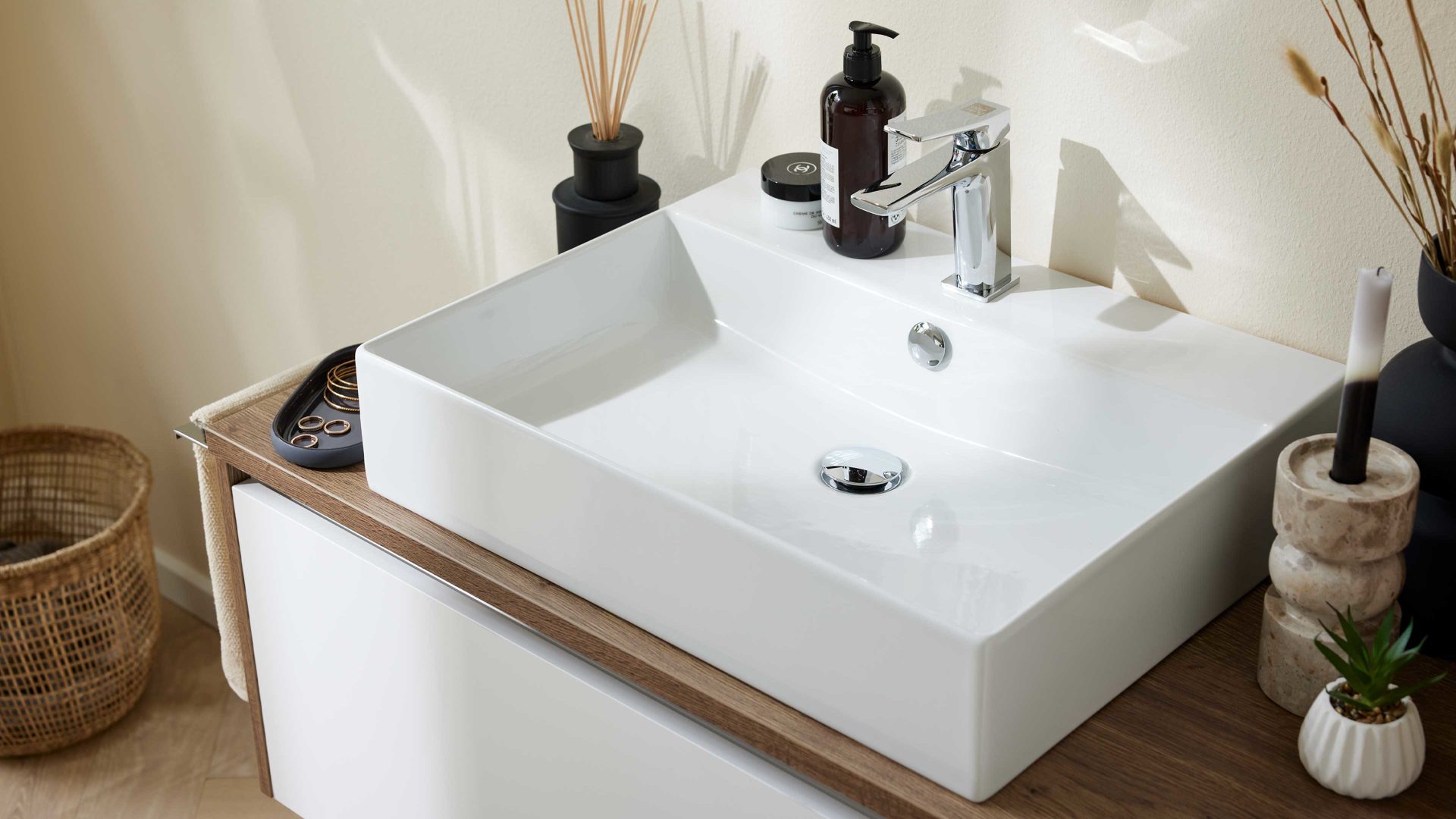 Der Aufsatz-Waschtisch (Typ 87755) aus hochglänzender, weißer Keramik überzeugt durch klare Linien und hochwertige Verarbeitung. Mit Maßen von ca. 60 x 12 x 46 cm (B/LxHxT) und einer Hahnlochbohrung passt er perfekt auf die Waschtischplatte – elegant, pflegeleicht und langlebig zugleich.