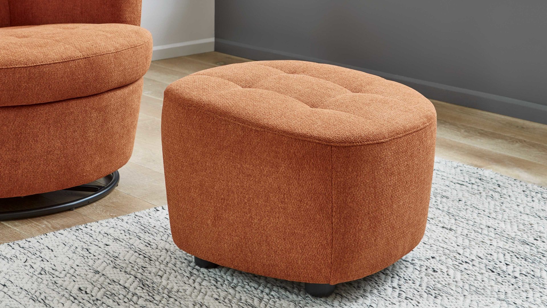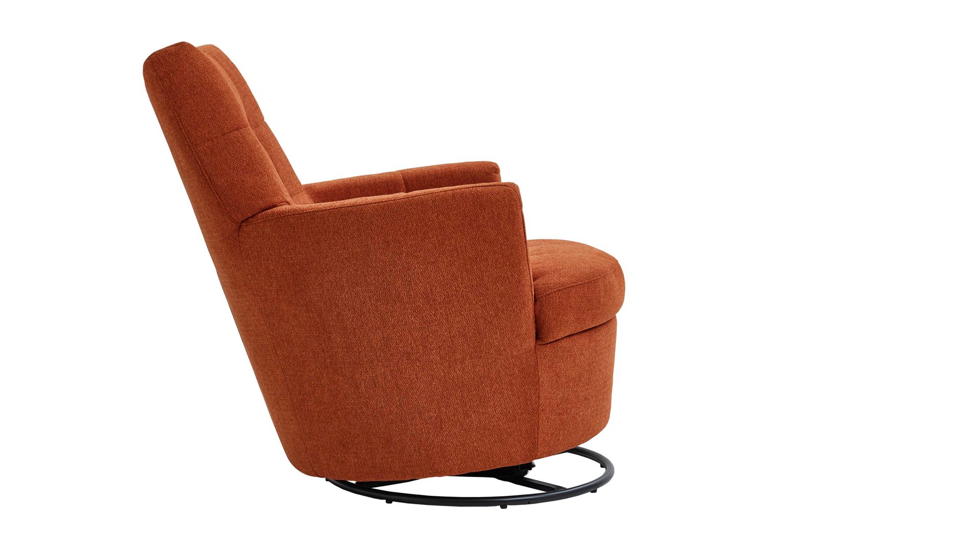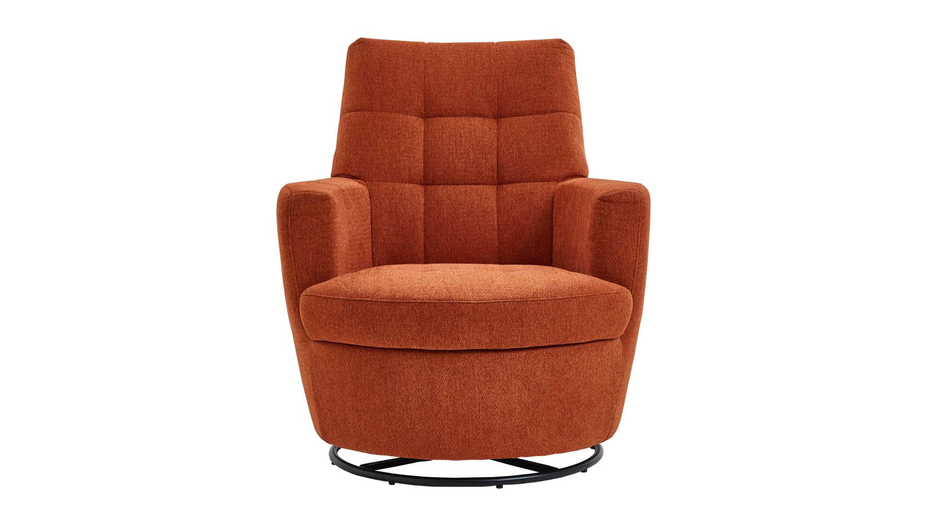 Mit seinem Signal-orangen Strukturbezug und dem schwarzen Metalldrehring wird dieser Sessel zum Blickfang in jedem Raum.