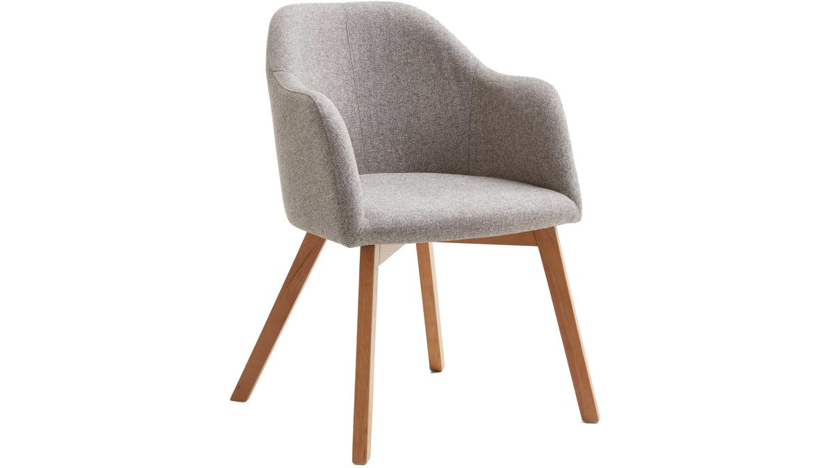 Der Armlehnstuhl Charly präsentiert sich modern und stilvoll designt. Darüber hinaus weiß er in puncto Komfort zu überzeugen. Lackierte Eichenholzfüße bilden die robuste Basis. Das natürliche Material sorgt einerseits für die nötige Stabilität und bringt andererseits ein warmes, einladendes Flair in den Raum. Attraktiv abgerundet wird der Vierfußstuhl durch den schlammfarbenen Webstoffbezug. Die trendige Farbe wirkt überaus elegant und harmoniert vorzüglich mit den Holzfüßen. Einen feinen Akzent setzt die Steppnaht im Rücken des Schalensitzes.