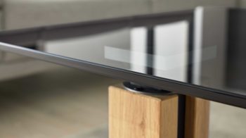 Ein besonderes Highlight ist die 10 mm starke ESG-Glasplatte, eingefasst in einen lackierten Metallrahmen, der dem Tisch eine feine Kontur und zusätzliche Stabilität verleiht. Die Metallelemente und die MDF-Bodenplatte sind anthrazit-metallicfarben lackiert und setzen moderne Akzente, die das hochwertige Erscheinungsbild perfekt abrunden. Durch die Kombination von Glas, Holz und Metall entsteht ein ausgewogener Mix aus Natürlichkeit, Leichtigkeit und industrieller Eleganz.