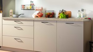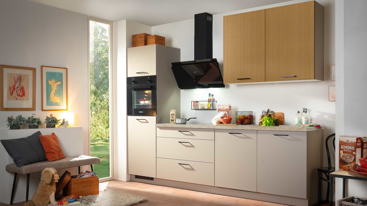 mattes Cremegrau, kombiniert mit hellbraunem Streifendekor und einer Arbeitsplatte in heller Granit-Nachbildung
