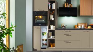hochgebauter Backofen, vollintegrierter Kühlschrank und eine kopffreie Dunsthaube
