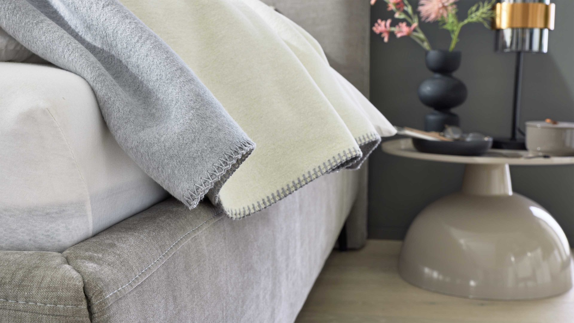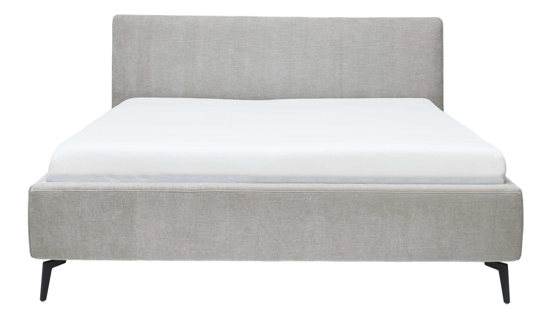 Die kubisch gepolsterten Bettseiten mit anthrazitfarben lackierter Innenseite bilden einen stilvollen Kontrast zum Stoffbezug und werden durch die schwarzen Metallfüße elegant ergänzt. Für individuelle Gestaltung stehen vier weitere Fußvarianten in zwei Höhen zur Auswahl.