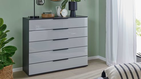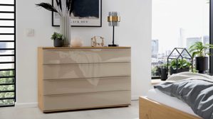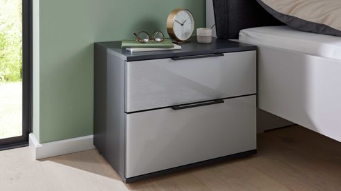 Die Interliving Schlafzimmer Serie 1210 überzeugt durch eine durchdachte Planungsvielfalt. Neben klassischen und wandhängenden Nachttischen bietet sie planbare Kleiderschränke in zwei Höhen, Sonderanfertigungen für Dachschrägen, passende Bettgestelle mit vierfach höhenverstellbarer Einlegetiefe sowie zahlreiche Kommodenlösungen. Materialien und Farben lassen sich individuell kombinieren – von Balkeneiche-Echtholzfurnier über weiße oder basaltfarbene Lackoberflächen bis zu Glas in Weiß, Sand, Seidengrau oder Taupe, ergänzt durch drei Griffvarianten.