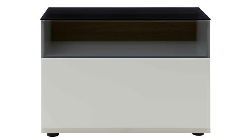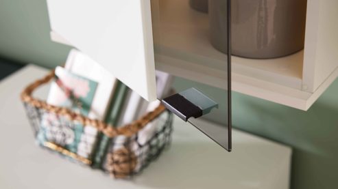 Aufsatz- und Unterbauregal für den Schreibtisch, kabellose Lademöglichkeit, Einbausteckdose und weitere dargestellte Einrichtungsgegenstände sind separat gegen Mehrpreis bestellbar.