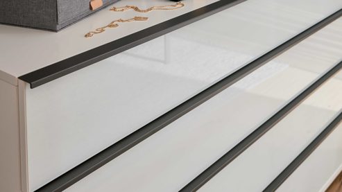 Modern, praktisch, hochwertig: Die Schubladenkommode aus der Interliving Schlafzimmer Serie 1033 verbindet ein klares, zeitgemäßes Design mit komfortabler Funktionalität. Der weiße Korpus, hochwertige Glasfronten in Weiß und schieferfarbene Griffleisten schaffen eine elegante Optik, die sich harmonisch in jedes moderne Schlafzimmerambiente einfügt.