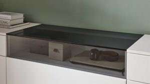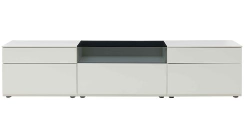 Das dreiteilige Lowboard mit ca. 240 x 54 x 45 cm (B/LxHxT) bildet das Herzstück der Wohnwand. Links sorgt ein Element mit zwei Schubladen für ordentlich Stauraum rund um Zubehör oder Technik. In der Mitte bietet ein Element mit großem Auszug, Glasfront und ESG-Glasoberboden den perfekten Platz für Receiver, Konsolen oder Multimedia-Geräte. Rechts wiederholt sich ein Element – ebenfalls mit zwei Schubladen, damit alles seinen festen Platz hat. So entsteht eine ausgewogene Kombination aus geschlossenem Stauraum und edlen Glasdetails.
