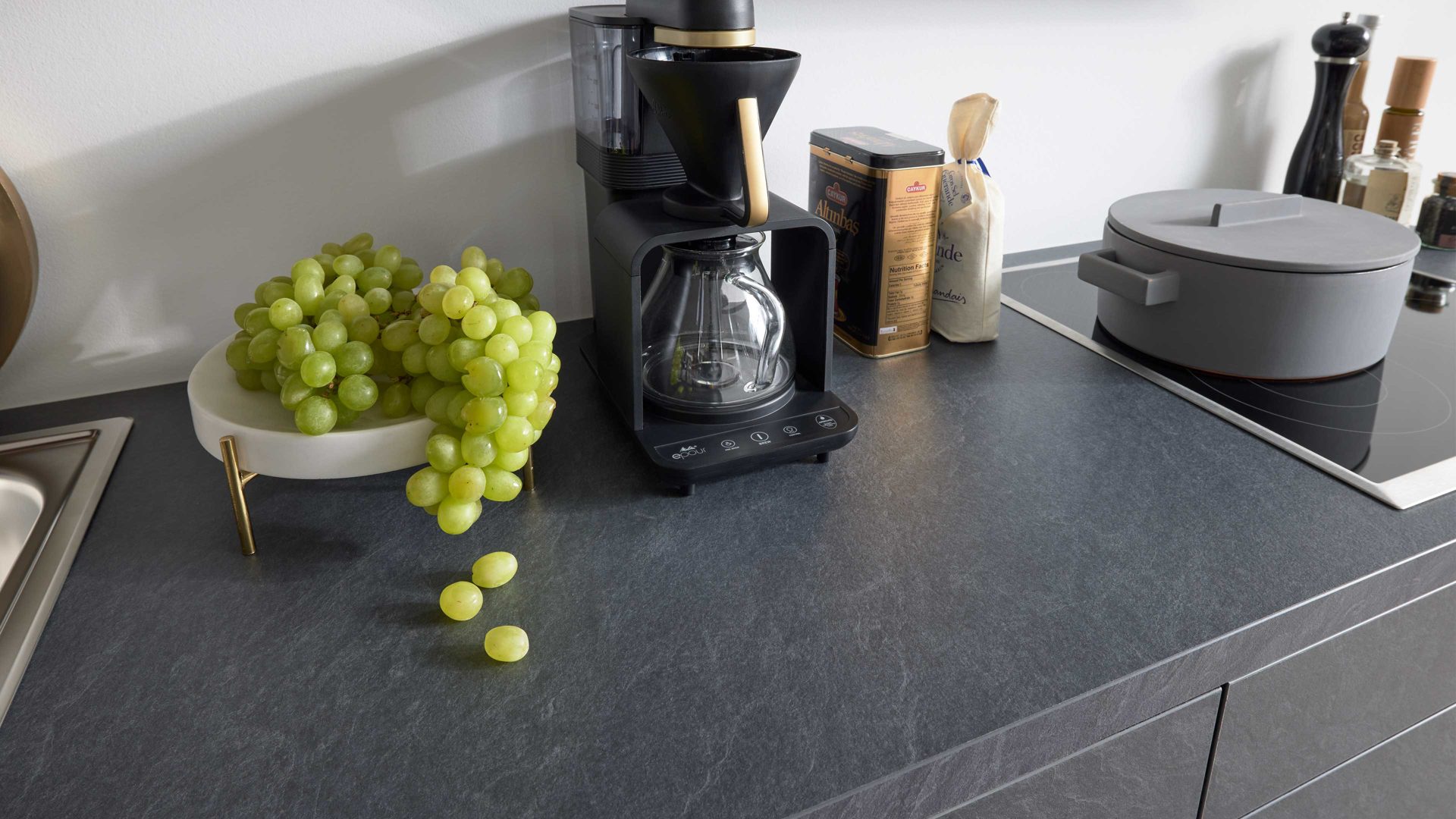 • Die Abbildung zeigt ein Wohnbeispiel, welches auch Dekoration sowie separat erhältliches Zubehör enthält. Im Lieferumfang enthalten sind eine Kücheninsel und eine Hochschranklösung.