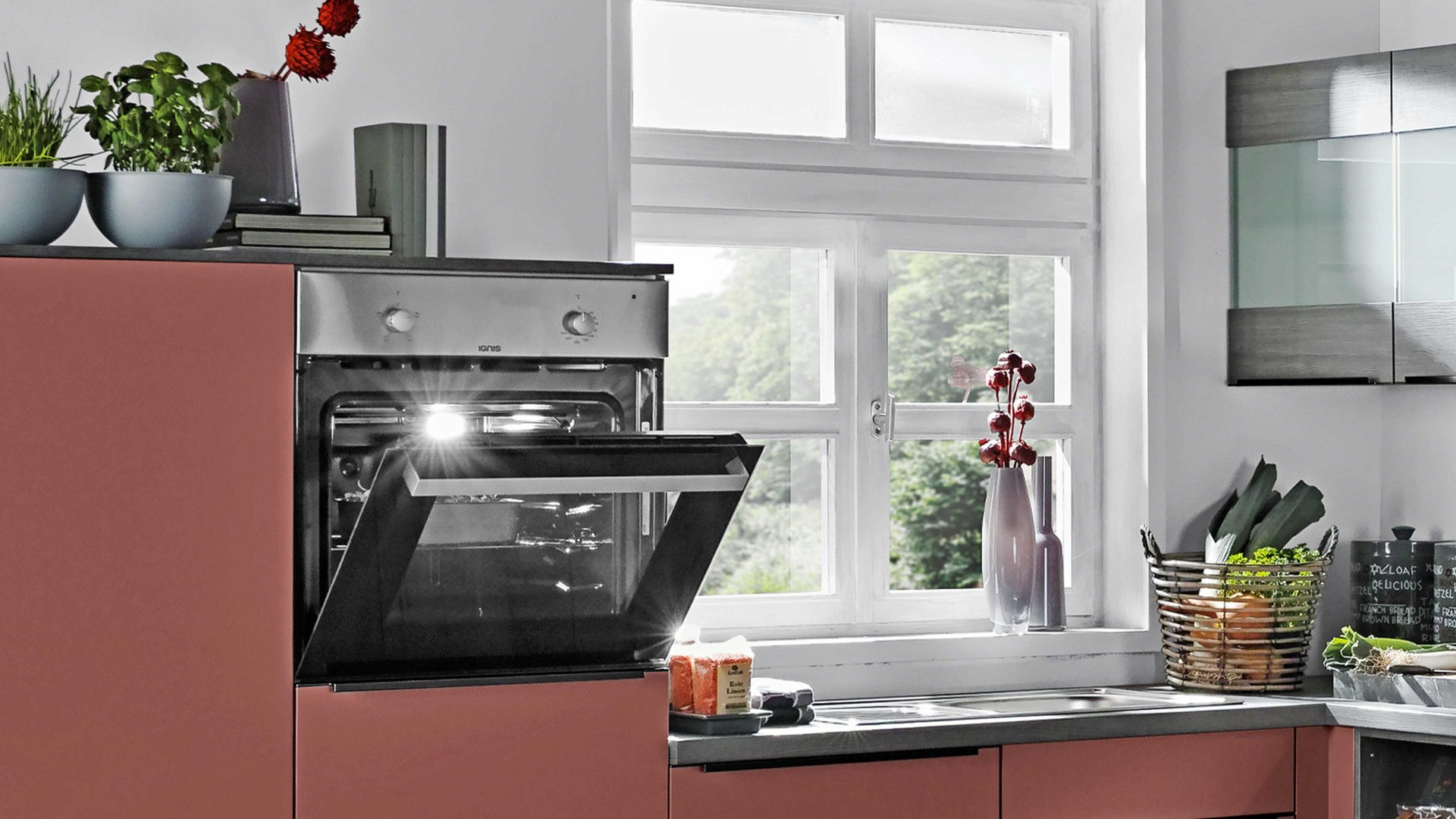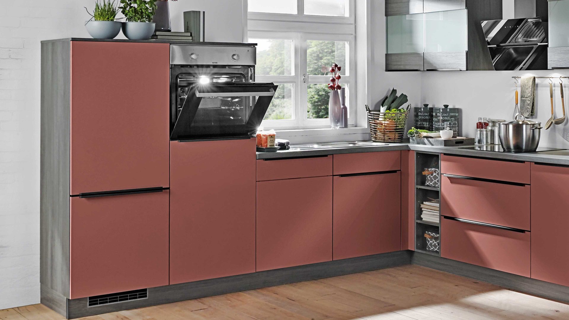 mattes Kaminrot, kombiniert mit grauer Eiche-Nachbildung