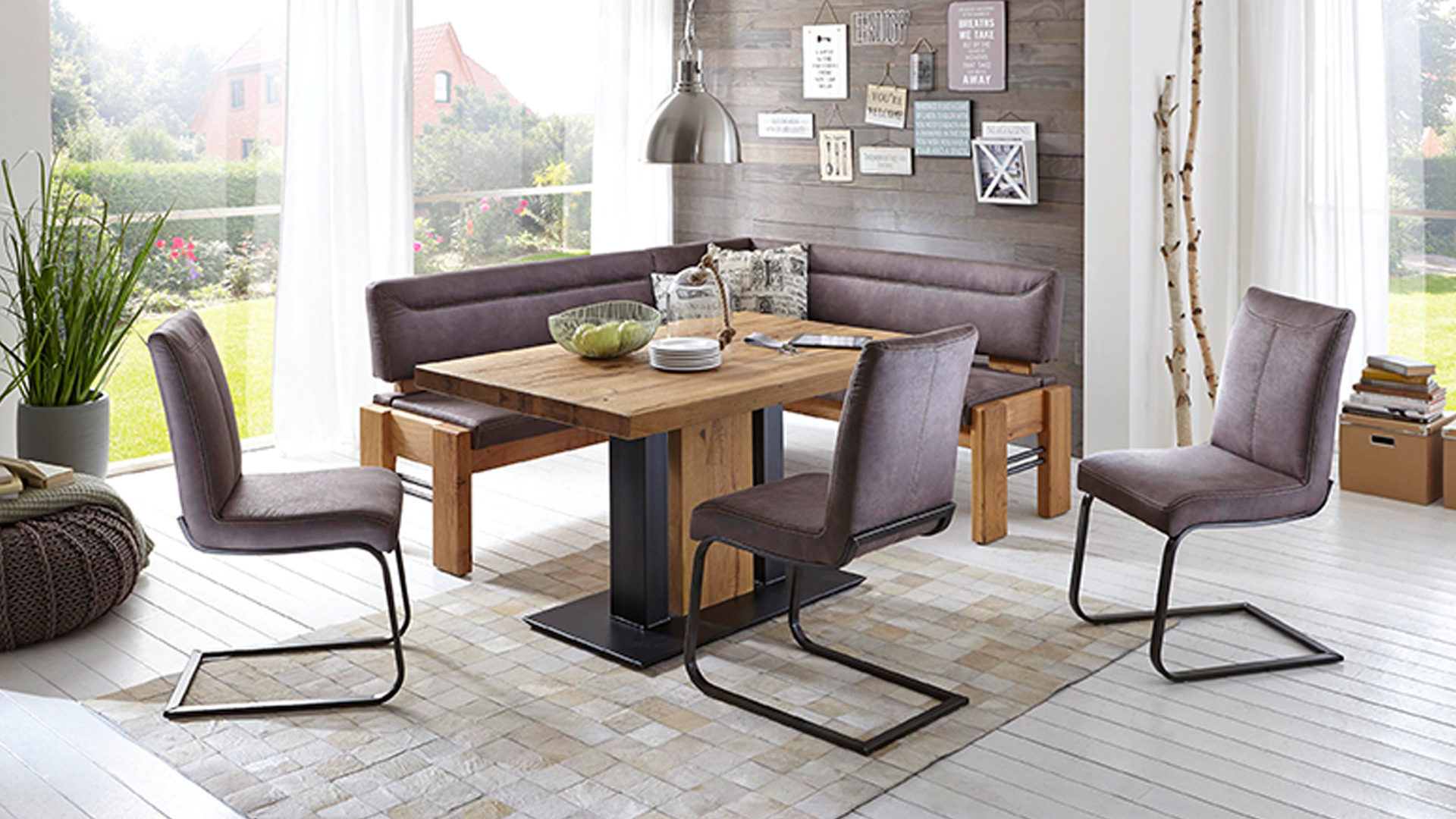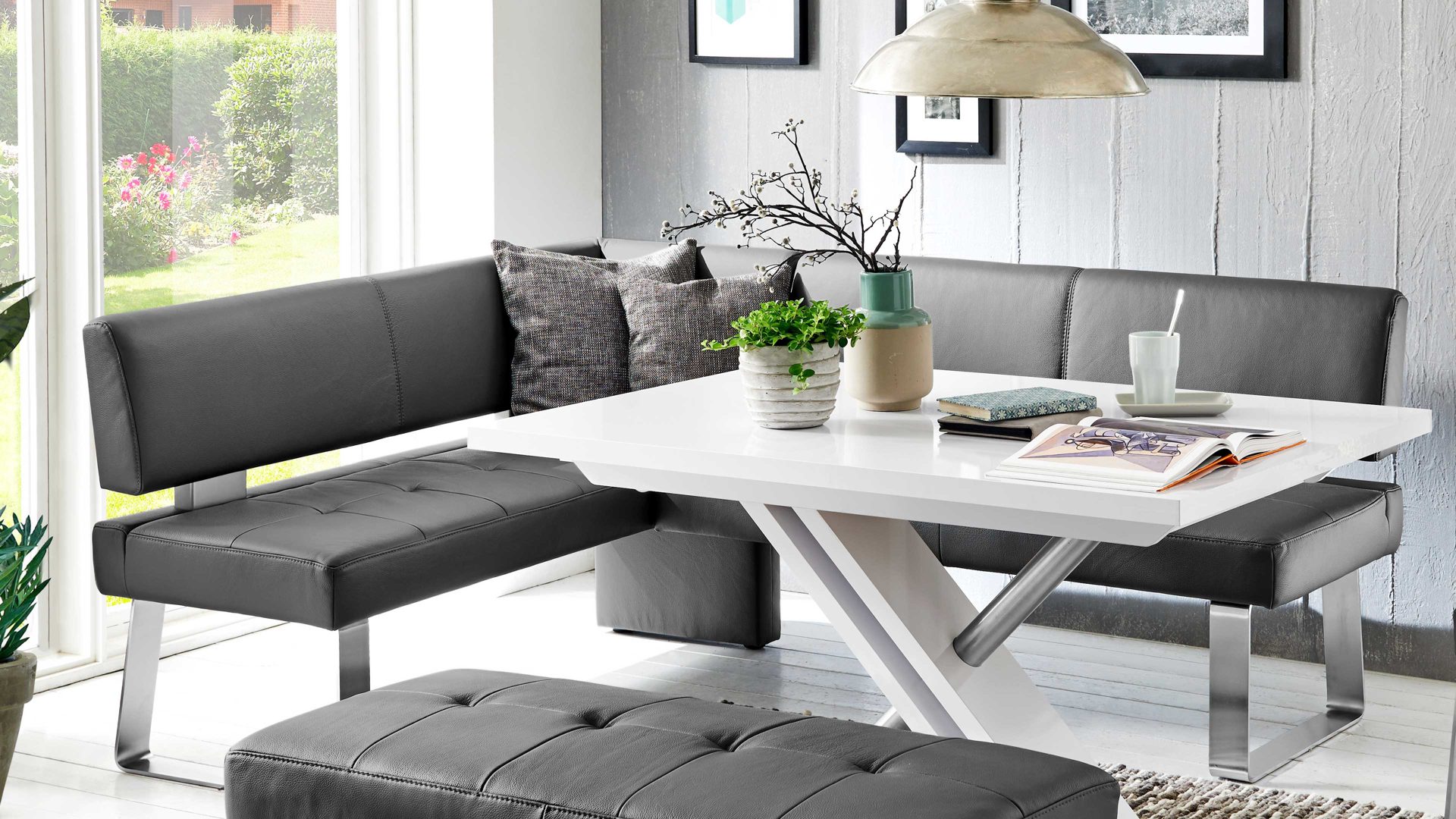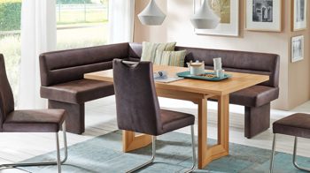 Stilvoll und elegant präsentiert sich die Dinnerbank mit einem grauen LongLife-Dicklederbezug, der sich mit den Nähten im selben Ton harmonisch in Ihre Kücheneinrichtung einfügt. Versammeln Sie Familie und Freunde um Ihren Küchentisch auf der Küchenbank, die Sie über Eck stellen und so auch ungenutzten Raum optimal ausfüllen.
