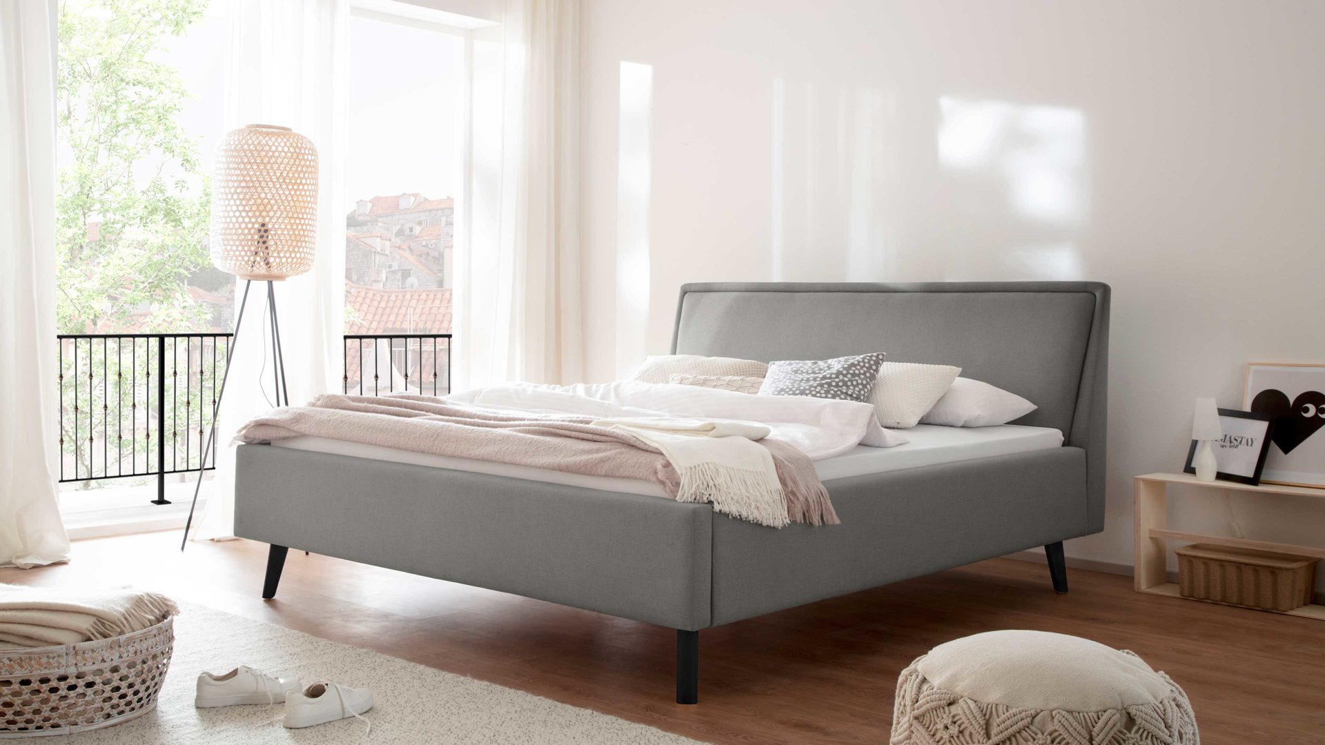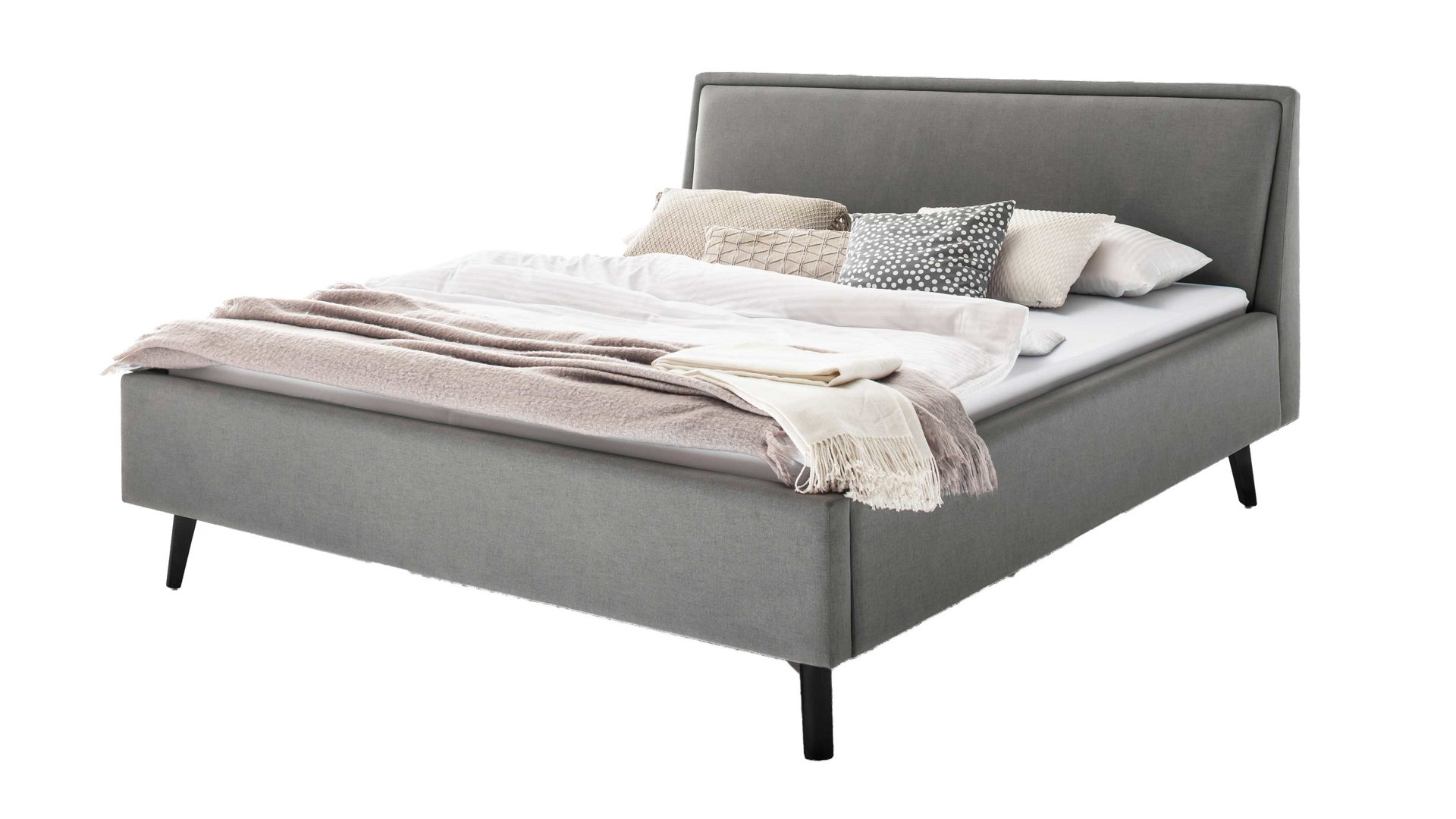Das Polsterbettgestell Frieda mit Bettkasten verkörpert modernen Komfort. Mit dem hellgrauen Stoffbezug und den schwarzen Holzfüßen präsentiert es sich elegant und gemütlich designt. Die Bettseiten sind genauso wie das Polsterkopfteil glatt bezogen. Letzteres ist eine angenehm weiche Rückenlehne, wenn Sie abends im Bett vor dem Schlafen noch entspannt in Ihrem Buch lesen oder fernsehen möchten.