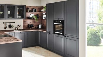graphitfarbene 3D-Lacklaminatfronten, kombiniert mit graphitfarbenen Korpussen und Sockelnblenden, Arbeitsplatten in Eiche Castell-Nachbildung und mattschwarze Knopfgriffen