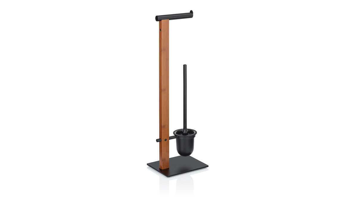 Ansprechende Toilettengarnitur in minimalistischem Design. Die Bürste mit Griff und der Becher sind in matt-schwarzer Optik, genau wie der Standfuß, und harmonieren perfekt mit dem Bambus-Element. Der integrierte WC-Papierrollenhalter sorgt dafür, dass das WC-Papier in Reichweite ist. Schwarzes matt pulverbeschichtets Metall, Gestell aus eingefärbtem Bambus, Maße ca. 20 x 70 cm (BxH)