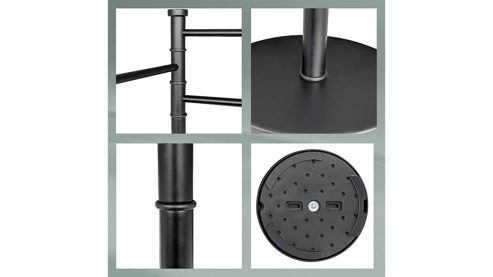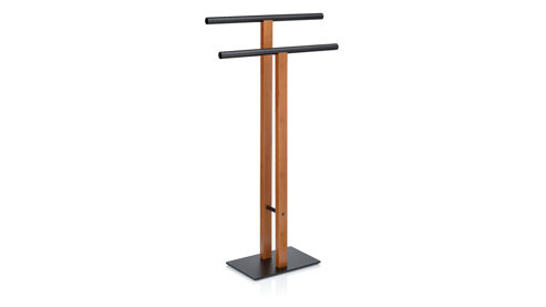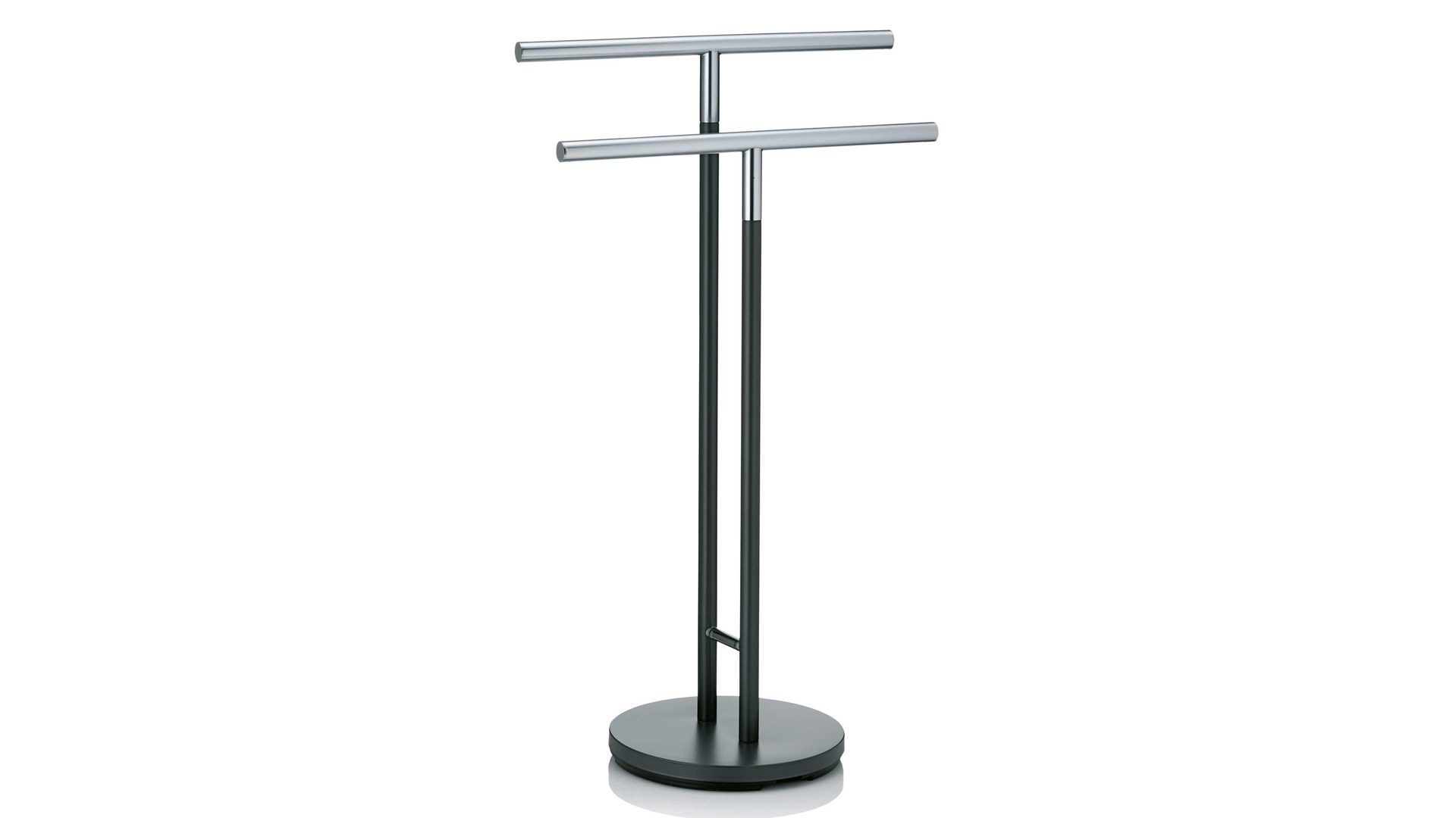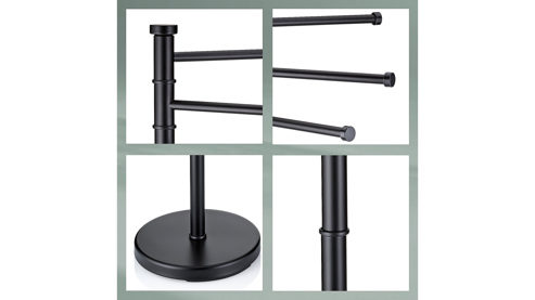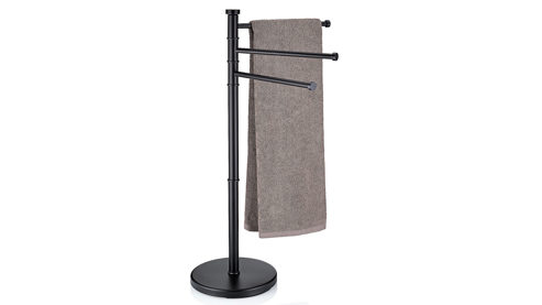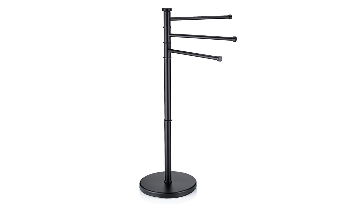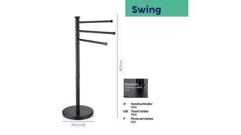 Handtuchhalter Swing aus matt schwarzem Edelstahl mit runder Standplatte mit einem Durchmesser von ca. 28,5 cm. Drei bewegliche Handtuchstangen bieten ausreichend Platz für die notwendigen Handtücher nach dem Duschen oder dem Baden. Mit einer Gesamthöhe von ca. 85,5 cm kann sich der Handtuchhalter durchaus sehen lassen.