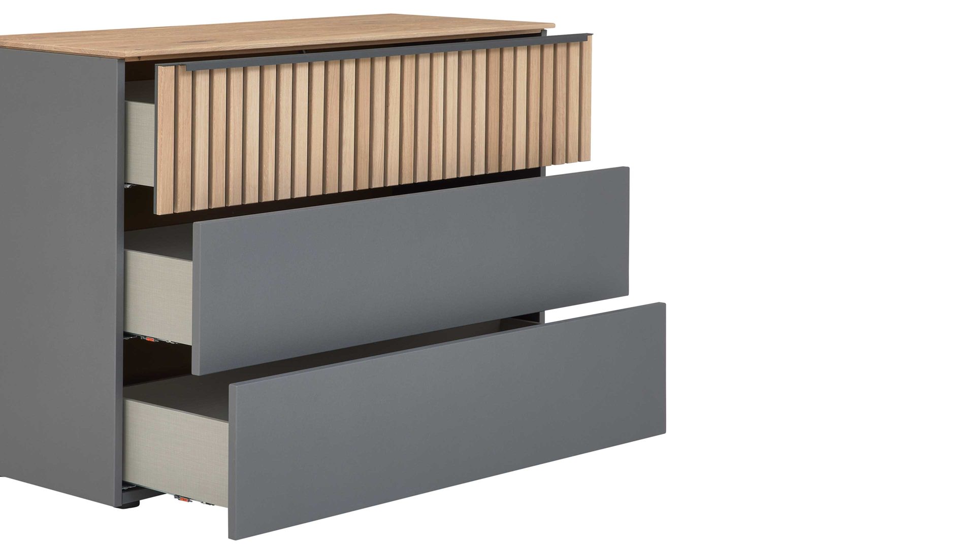 Die Schubladenkommode aus der Interliving Schlafzimmer Serie 1029 kombiniert modernen graphitfarbenen Lack mit warmem Wildeiche-Massivholz. Ein in Eisenglimmer pulverbeschichteter Metallgriff setzt einen stilvollen Akzent und verleiht der Kommode eine ruhige, hochwertige Ausstrahlung.