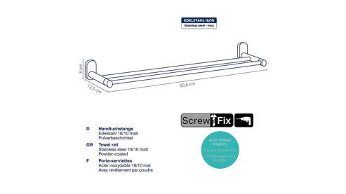 Unser Handtuchhalter Alessio in mattem Schwarz und aus hochwertigem Edelstahl ist ein stylisches Must-have für jedes moderne Badezimmer! Mit Platz für mehrere Handtücher bietet er praktische Funktionalität und lässt sich ganz einfach an der Wand befestigen, entweder durch Bohren oder Kleben. Sein schlankes Design passt perfekt in jeden Raum und verleiht deinem Bad einen eleganten Touch. Hol dir jetzt Qualität und Style für deine Handtücher. Montagematerial zum Bohren liegt bei. Maße ca. 61 x 6 x 13 cm (BxHxT)