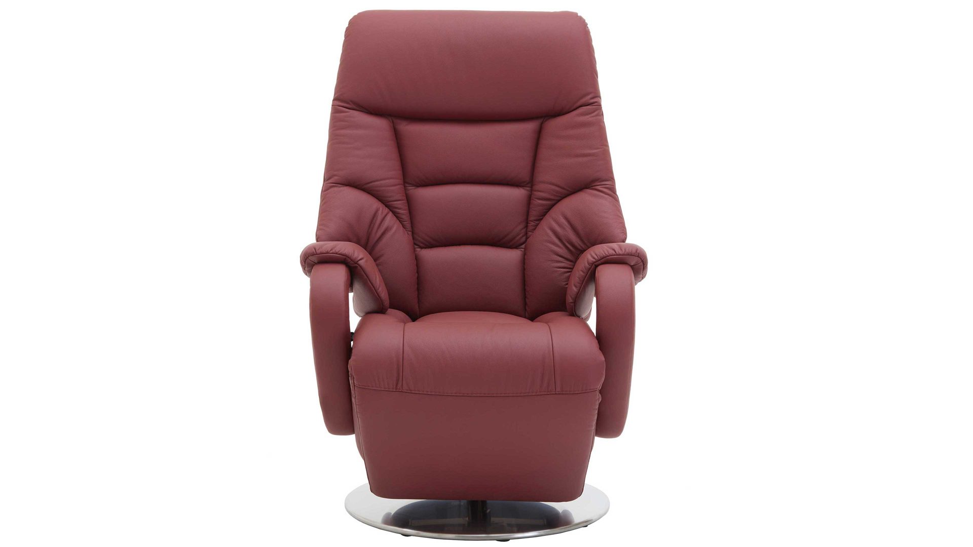 Dieser Relaxsessel kombiniert einen robusten glänzenden Edelstahl-Tellerfuß mit einem stilvollen merlotfarbenen Lederbezug. Durch die optimal aufeinander abgestimmten Materialien und Farben strahlt der Fernsehsessel moderne Eleganz aus. Für die nötige Stabilität sorgt der Stahlrohrrahmen. Er macht den TV-Sessel bis 130 kg belastbar. Die Maße des hochwertig verarbeiteten Relaxsessels belaufen sich auf ca. 80 x 116 x 80 cm (BxHxT), bei einer Sitzhöhe von ca. 49 cm und einer Sitztiefe von ca. 55 cm.