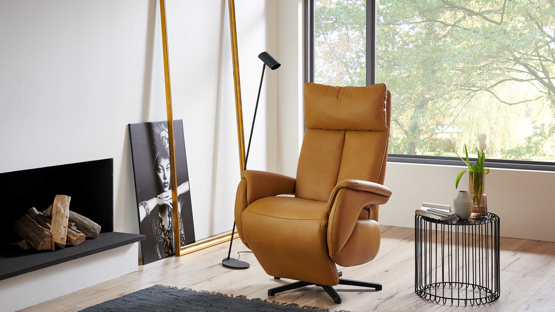 Dieser Relaxsessel kombiniert einen robusten mattschwarzen Metall-Sternfuß mit einem stilvollen senffarbenen Lederbezug.