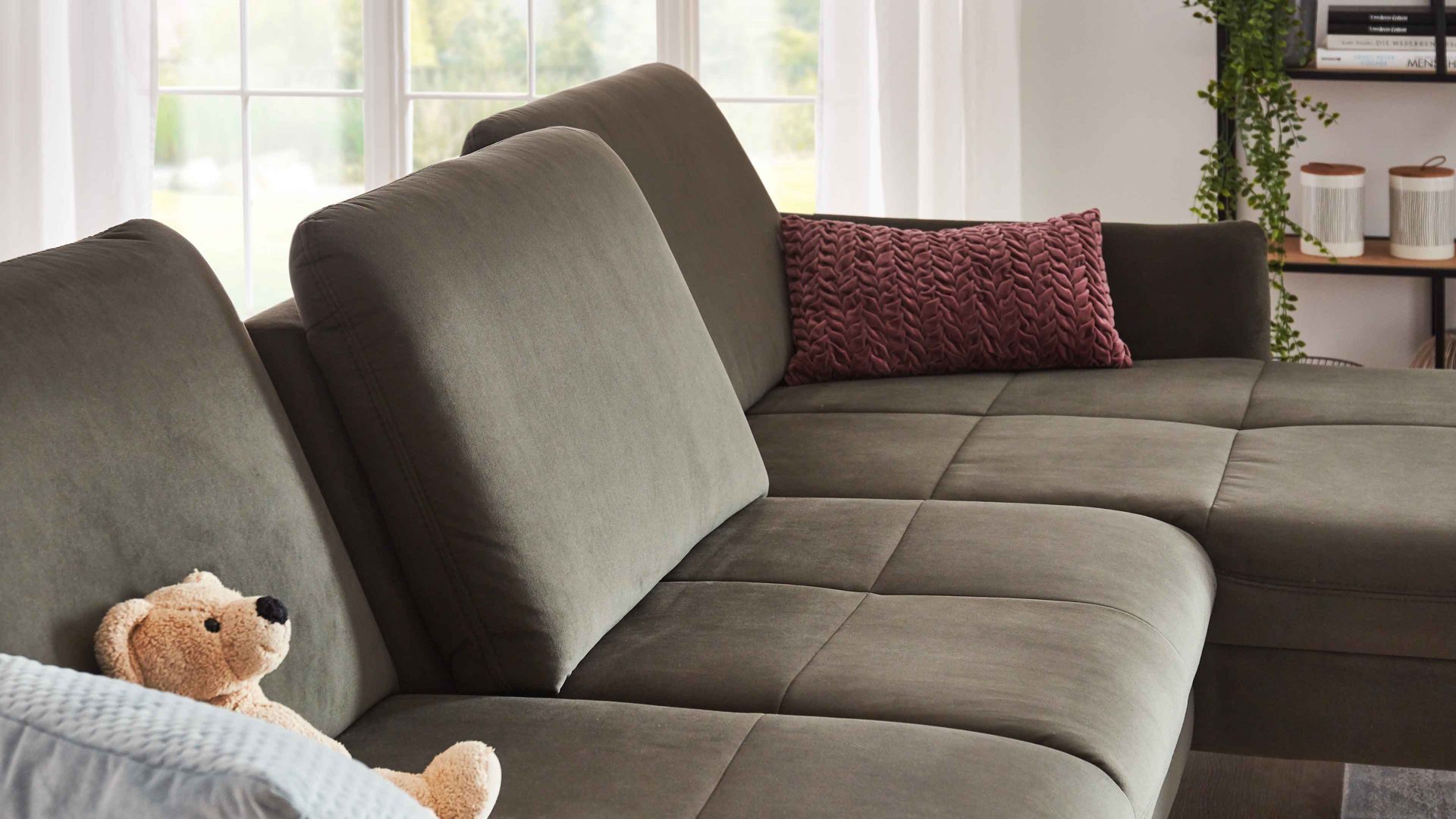 Zu den Highlights des Polsterprogramms gehören die grundsätzlich im Originalstoff bezogenen Rückseiten sowie die für Staubsaugerroboter ideale Bodenfreiheit. Die Serie ist Made in Europe und mit dem Goldenen M ausgezeichnet.