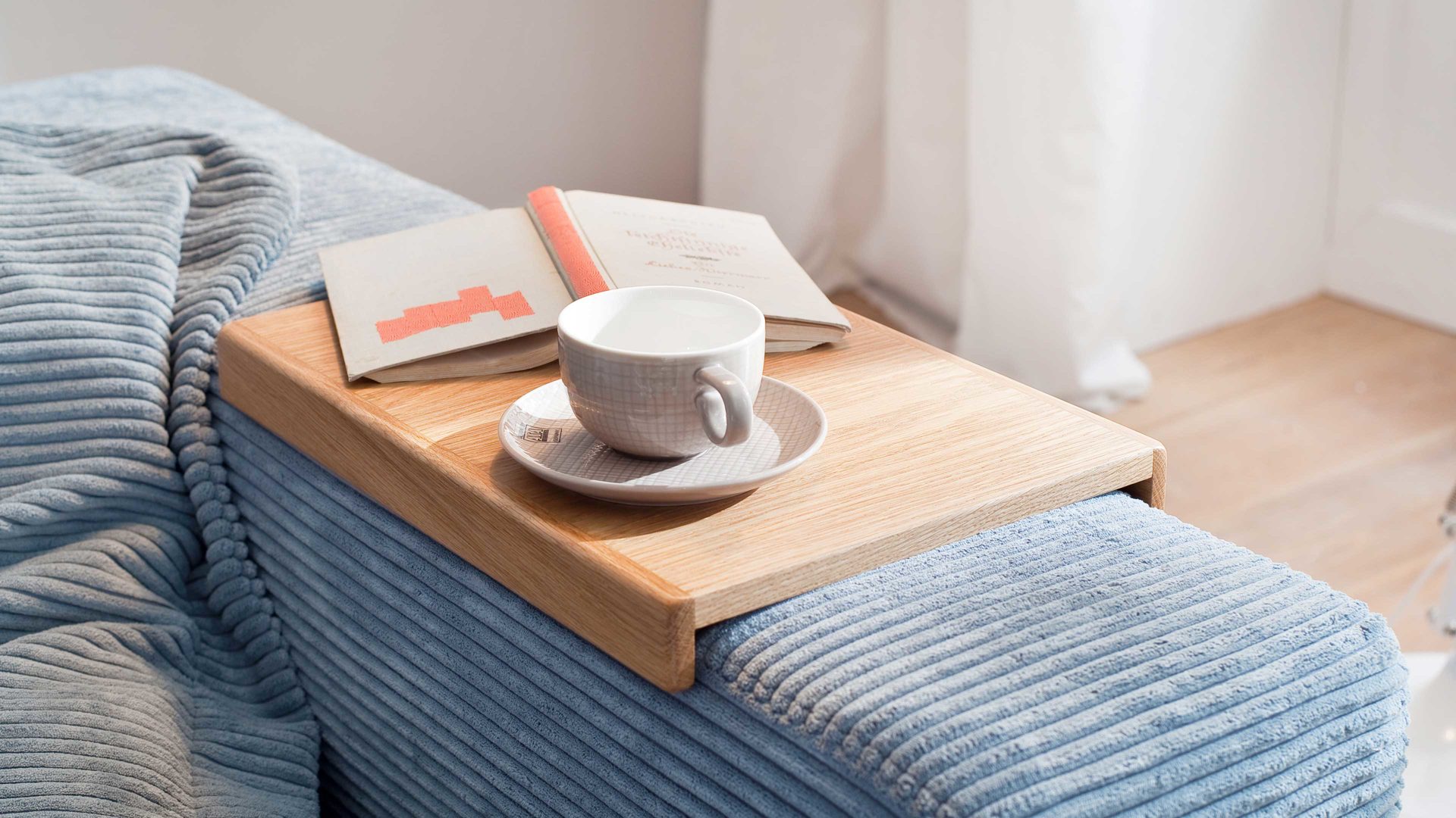 Das Armlehn-Tablett ist ein nützliches Zubehör für den Polsterhocker aus dem Polsterprogramm SOFAkultur Seventies.