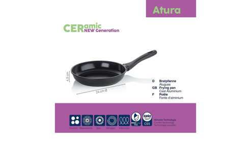 Entdecken Sie unsere hochwertige Bratpfanne Atura aus Aluguss mit innovativer Keramikbeschichtung, die eine ausgezeichnete Leistung bietet. Die zweischichtige Beschichtung überzeugt durch ihre hohe Kratzfestigkeit und den langanhaltenden Antihafteffekt, was das Kochen und Braten besonders angenehm macht. Der Allherdboden für eine optimale Hitzeverteilung sorgt. Diese Pfanne ist für alle Herdarten geeignet und lässt sich nach dem Kochen mühelos reinigen. Erweitern Sie Ihre Küche mit weiteren Produkten aus dieser Serie für eine umfassende Ausstattung. Maße ca. 24 cm Durchmesser, Höhe ca. 4,5 cm