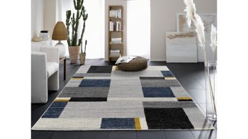 Moderne Mosaikstruktur in angenehm-dezenten Farbverläufen. Dieses Modell gehört zu den Wohnaccessoires mit geometrisch angeordneten Vierecken in verschiedenen Größen und Kolorierungen. Sie sorgen für Form- und Farbenvielfalt, gleichmäßige Struktur und erzeugen ein harmonisches Karreefeld des Designerteppichs Castle Beppo. Der Webteppich ist seitlich gekettelt und vor Kopf umgeschlagen.