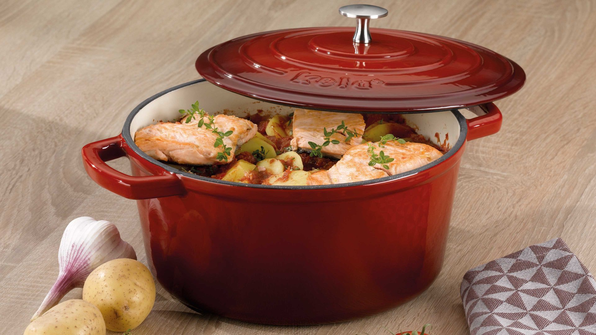 kela Bräter Calido | Gusseisen mit glatter Emaille-Beschichtung innen und emaillierten Rotverlauf außen | Größe Durchmesser ca. 26 x 12 (DxH) | Bodenfläche ca. 20 cm (Durchmesser) | Inhalt ca. 4,6 Liter | Edelstahl-Deckelknopf | große Griffe | einfache Reinigung | gleichmäßige Hitzeverteilung | gute Wärmespeicherung | energiesparend | perfekt für Anbraten und Schmoren | backofenfest bis 300 Grad Celsius | für alle Herdarten geeignet, auch für Induktion | zehn Jahre Hersteller-Qualitätsgarantie | in verschiedenen Farben und Größen bestellbar