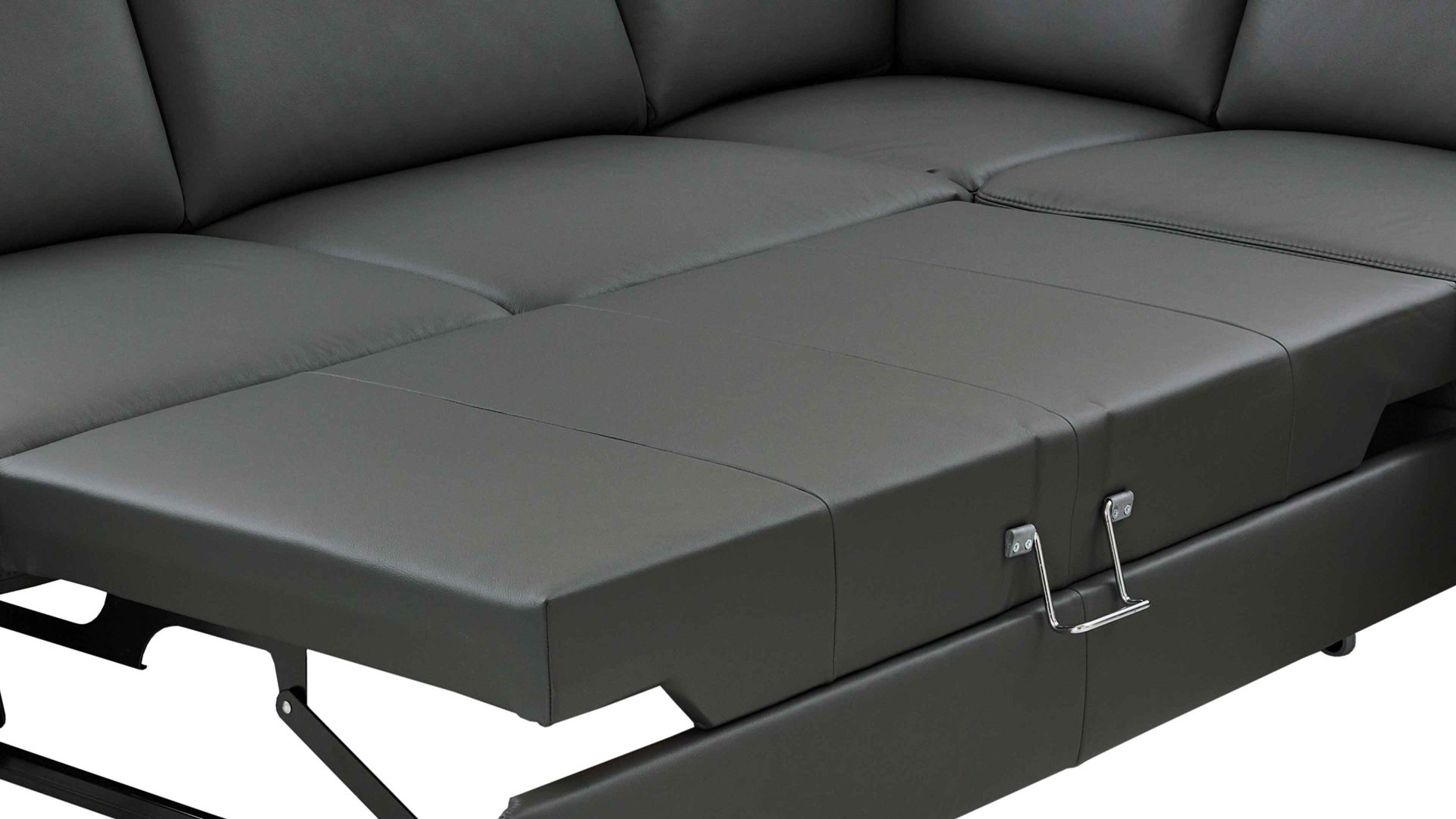 Die lederbezogene Liegefläche ist ein Mehrpreis für die Möbel mit Bettfunktion aus dem Modulmaster-Polsterprogramm MM-PN1168. Durch dieses Extra präsentiert sich die Liegefläche im Originalbezug des jeweiligen Sofas. Das anthrazitfarben pigmentierte Glattleder präsentiert sich modern und elegant.