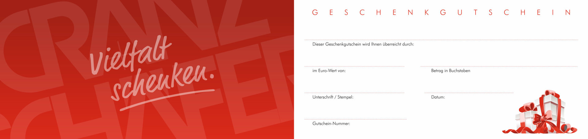Nachdem Sie den Kauf über unseren Webshop abgeschlossen haben, erhalten Sie den entsprechenden Geschenkgutschein als geschmackvoll gestaltete Klappkarte per Post an die von Ihnen gewünschte Lieferadresse. Möchten Sie den Gutschein direkt an eine andere Person senden lassen, haben Sie in der Bestellabwicklung die Möglichkeit eine abweichende Lieferadresse anzugeben. In diesem Falle vermerken Sie bitte im Textfeld »Hinweise für Ihre Bestellung...«, in der Bestell-Zusammenfassung den Namen der Person die den Gutschein verschenkt.