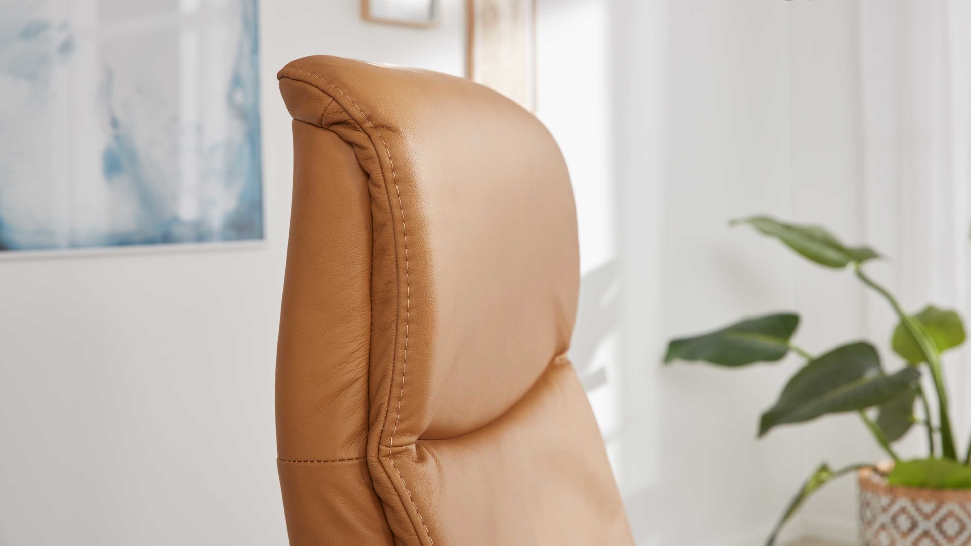 Mit dem kurkumafarben pigmentierten Glattlederbezug samt Ton-in-Ton-Kappnaht strahlt er moderne Eleganz aus. Für hohe Standfestigkeit sorgt der mattschwarze Metall-Sternfuß AD4S, der die Optik zudem harmonisch abrundet.