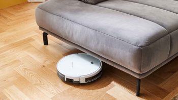 grauer Stoffbezug in Samtoptik und mattschwarze Metall-Winkelfüße
