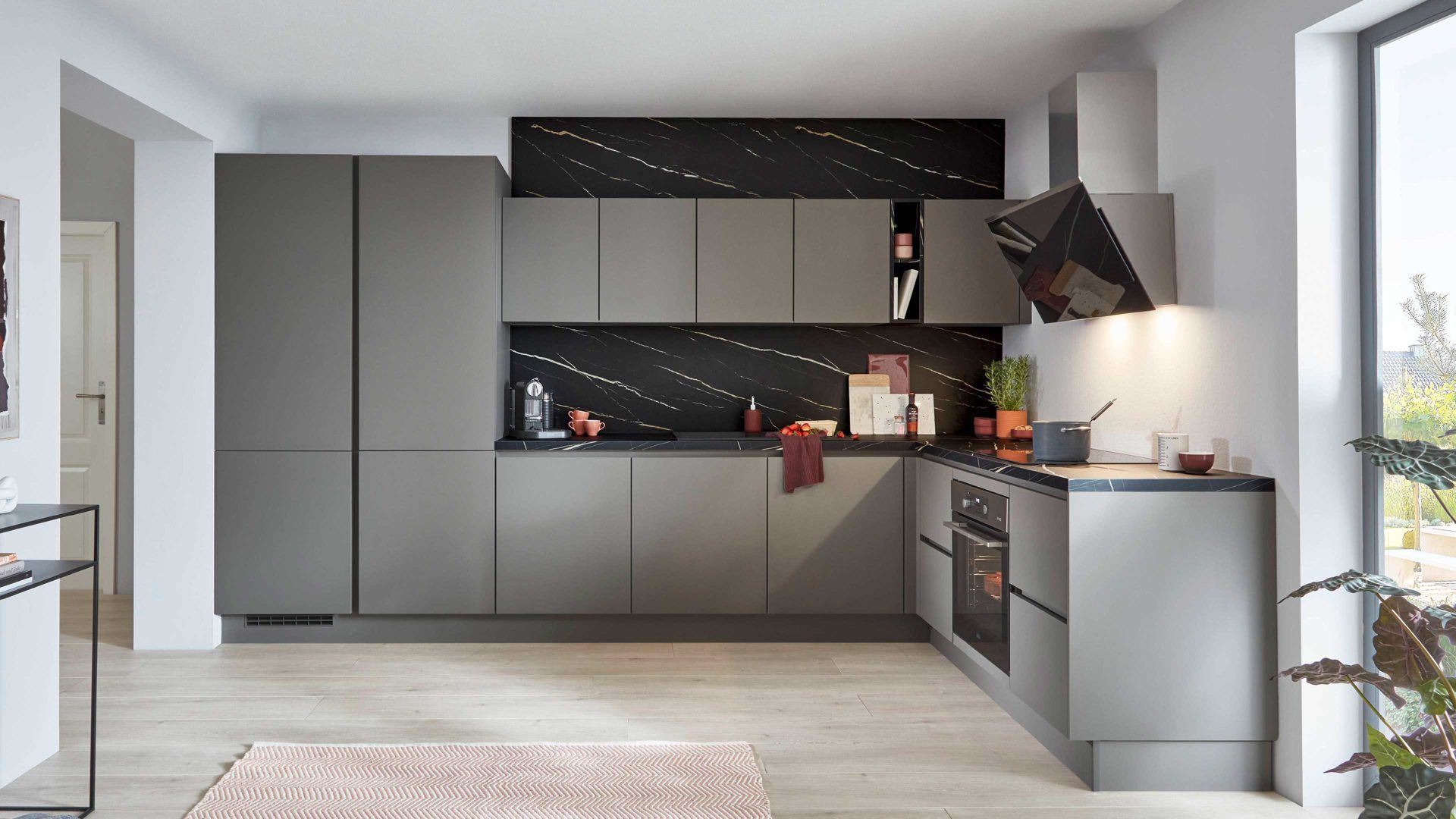 Die Kombination mit Arbeitsplatten in biancofarbener Marmor-Nachbildung bringt eine helle, edle Note ins Gesamtbild und sorgt für einen harmonischen Kontrast zu den grauen Fronten.
