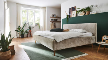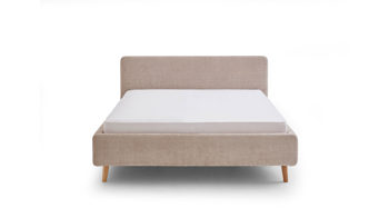 Das Polsterbettgestell Mattis begeistert durch die elegante Optik sowie die hervorragende Material- und Verarbeitungsqualität. Es kombiniert einen beigefarbenen Chenille-Bezug mit eichefarbenen Holzfüßen. Sowohl die Bettseiten als auch das Polsterkopfteil sind glatt bezogen. Letzteres lädt Sie ein, sich anzulehnen, wenn Sie abends im Bett vor dem Schlafen noch fernsehen oder in einem Buch lesen.