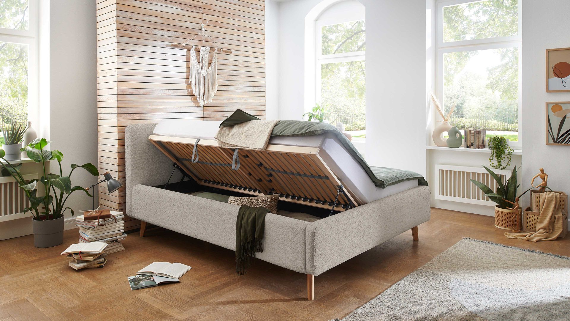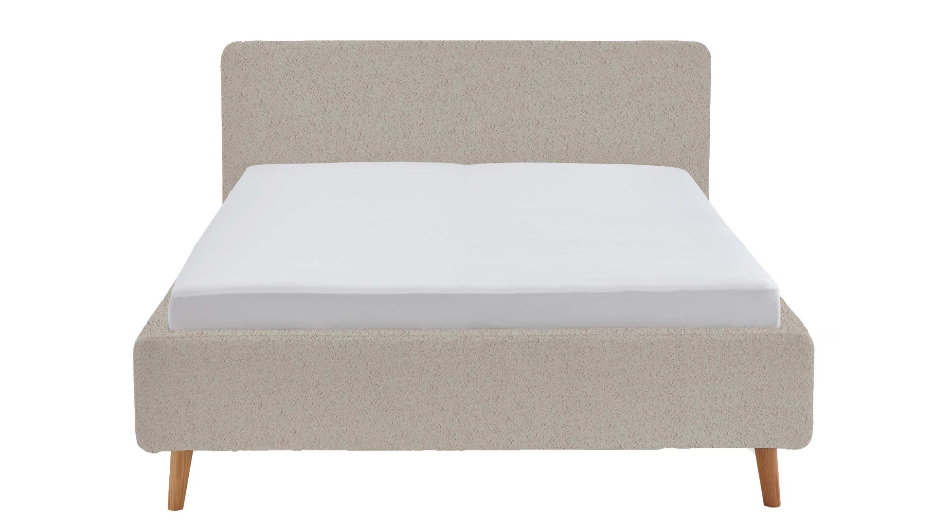 Das Polsterbettgestell Mattis begeistert durch die elegante Optik sowie die hervorragende Material- und Verarbeitungsqualität. Es kombiniert einen beigefarbenen Boucle-Bezug mit eichefarbenen Holzfüßen. Sowohl die Bettseiten als auch das Polsterkopfteil sind glatt bezogen. Letzteres lädt Sie ein, sich anzulehnen, wenn Sie abends im Bett vor dem Schlafen noch fernsehen oder in einem Buch lesen.