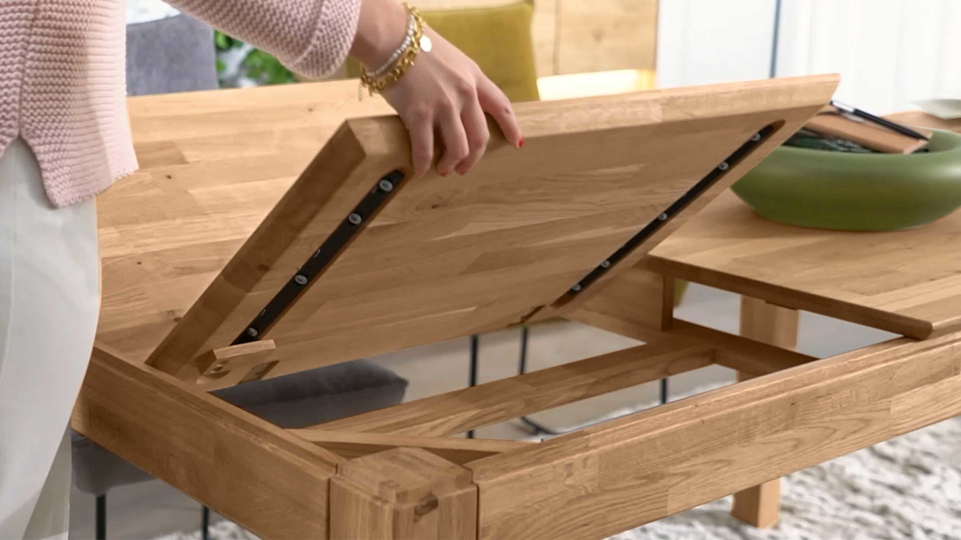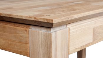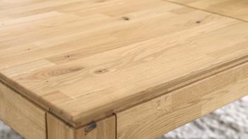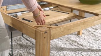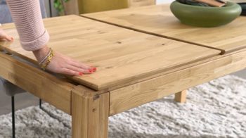 Die parkettverleimte Tischplatte mit Schweizer Kante verleiht dem Tisch eine edle Note und sorgt gleichzeitig für zusätzliche Stabilität. Mit seinem Butterfly-Auszug mit einer Einlegeplatte von ca. 60 cm Länge ist der Tisch ausziehbar und kann so flexibel an Ihre Bedürfnisse angepasst werden.