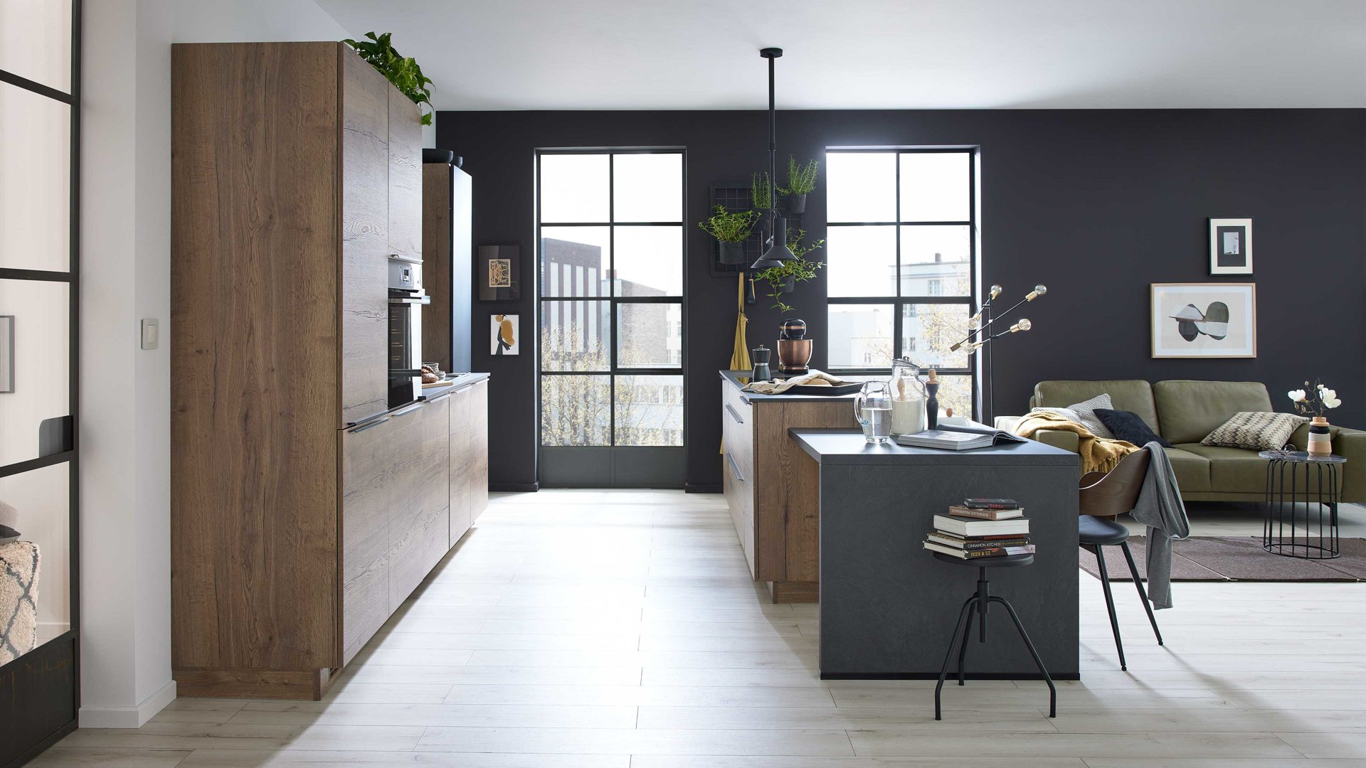 Culineo® Einbauküche C382 mit AEG Einbaugeräten – moderne Eleganz in Holz und Schwarzglas