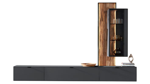 graphitgrauer Mattlack, kombiniert mit massivem soft gebürstetem Spaltholz und carbonfarben pulverbeschichtetem Metall
